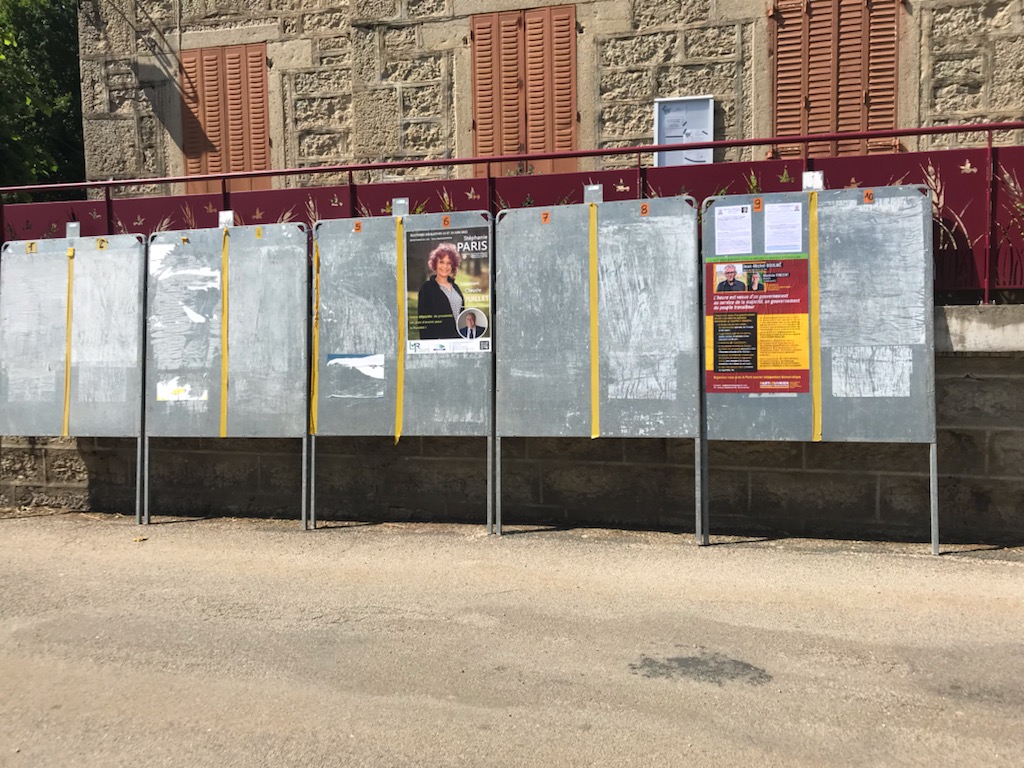 Journée collage d’affiches hier dans les communes de montagne de la 5° circonscription de l’Ain. Aucun des trois principaux candidats n’a collé d’affiches, ni les autres, sauf dans les cités industrielles. Reflet de l’intérêt des candidats pour les travailleurs des communes rurales ? Les panneaux sont tous vierges à l’exception du POID et du parti de la ruralité.